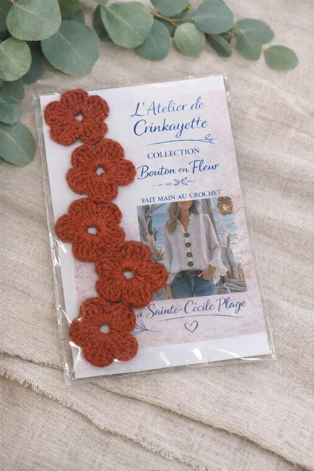 Découvrez nos petites fleurs à accrocher sur les boutons, entièrement faites main au crochet.