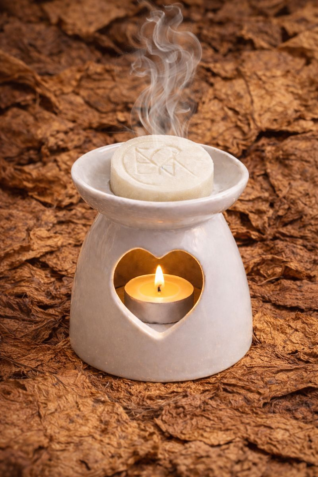 La senteur Feuille de Tabac dévoile un parfum profond, enveloppant et intensément chaleureux. Dès la fonte, elle libère des notes riches et légèrement sucrées de feuilles de tabac séchées, rappelant les salons feutrés, le cuir patiné et le bois chaud.